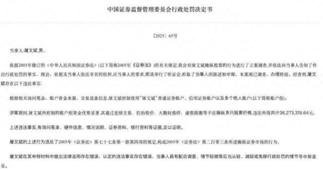 对此,中国证监会决定:一、针对屠文斌违法所得30万元以上的相关操纵行为,共没收违法所得3485.6万元,并处以3485.6万元罚款;二、针对屠文斌违法所得不足30万元的相关操纵行为,共没收违法所得141.7万元,并处以400万元罚款;三、针对屠文斌无违法所得的相关操纵行为,共处以180万元罚款。