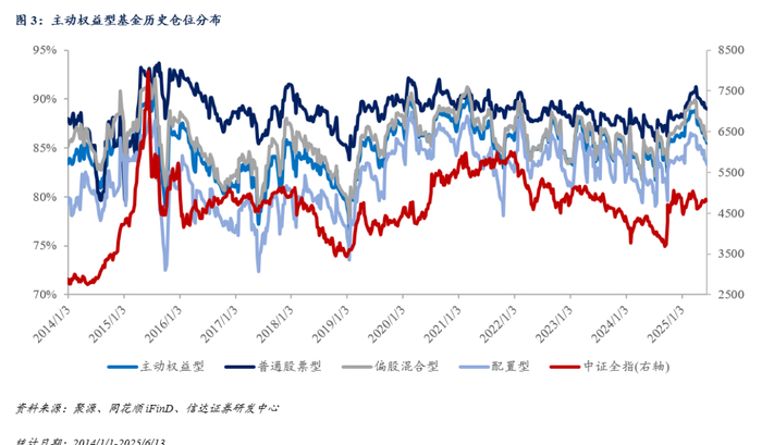 从整体仓位来看,截至2025/6/13,主动权益型基金的平均仓位约为85.50%。其中,普通股票型基金的平均仓位约为88.98%(较上周下降0.14pct),偏股混合型基金的平均仓位约为85.71%(较上周下降0.47pct),配置型基金的平均仓位约为83.29%(较上周下降0.46pct);“固收+”基金平均仓位约为24.39%,较上周上升0.09pct。