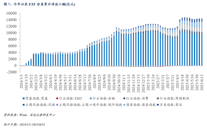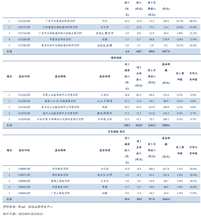 本周(2025/6/9-2025/6/13),境内股票ETF资金合计净流出约166.55亿元,合计净流出约6.43亿元,合计规模为5416.96亿元;债券ETF合计净流入约138.27亿元,合计规模为3200.38亿元;商品ETF合计净流入约20.39亿元,合计规模为1616.58亿元。
