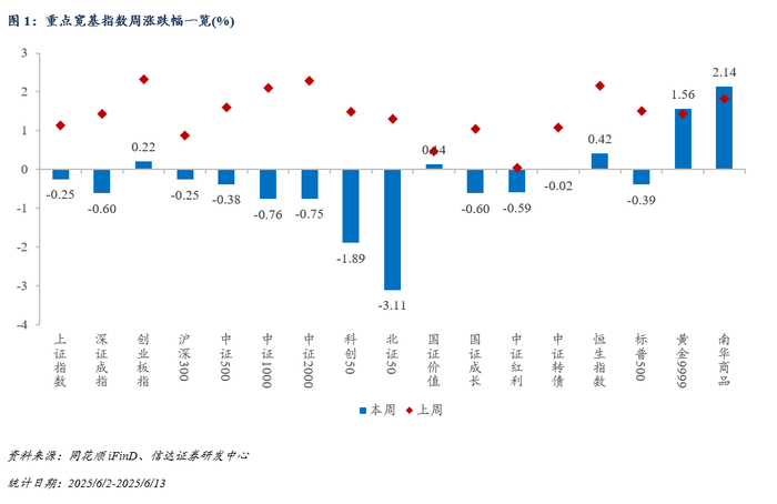 宽基指数表现回顾:本周(2025/6/9-2025/6/13)A股各宽基指数略微下跌,黄金资产表现强势。截至2025/6/13,上证指数报收3377点,周涨跌幅约-0.25%;深证成指报收10122.11点,周涨跌幅约-0.60%;创业板指报收2043.82点,周涨跌幅约0.22%;沪深300报收3864.18点,周涨跌幅约-0.25%。