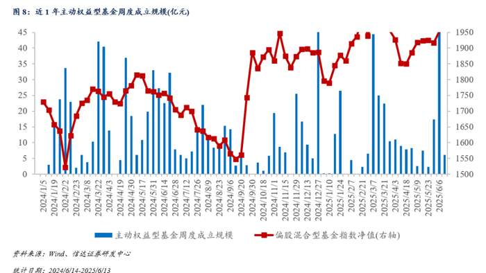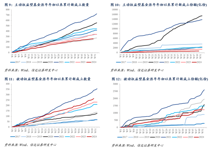 本周境内新成立基金数目共计16只,主动权益型基金新发总份额约为6.06亿份,为近 1 年36.00%分位。今年以来,主动权益型基金新发91只,规模合计约307.75亿元,约为2024年同期水平的71.78%;被动权益型基金新发258只,规模合计1386.11亿元,约为2024年同期水平的315.26%。