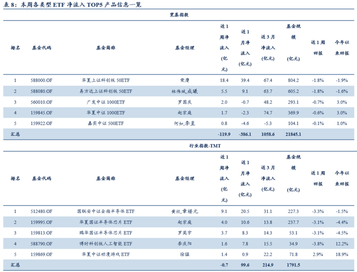 宽基ETF方面,本周资金净流出约119.86亿元,合计规模为21845.11亿元。其中,净流入较多的产品为华夏上证科创板50ETF、易方达上证科创板50ETF、广发中证1000ETF、华夏中证1000ETF、嘉实中证500ETF,净流入金额分别为18.44亿元、5.51亿元、1.97亿元、1.69亿元、0.79亿元。