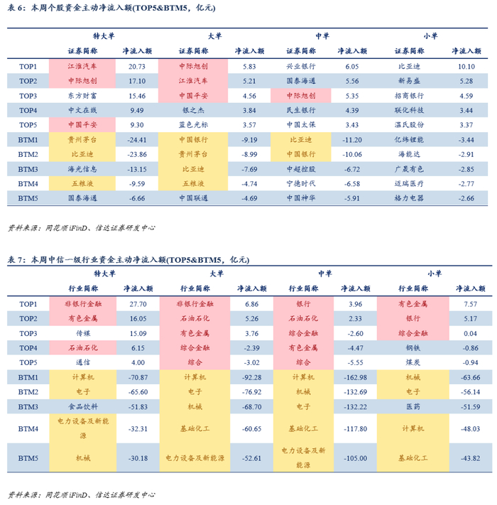 主力资金流:本周主力净流入非银金融、石油石化(1)个股:主力净流入&中小单净流出:紫金矿业、东方财富、海能达、恒玄科技、工商银行等。主力净流出&中小单净流入:比亚迪、贵州茅台、海光信息、五粮液、新易盛等。(2)行业:主力净流入&中小单净流出:非银行金融、石油石化、银行、有色金属等。主力净流出&中小单净流入:计算机、电子、机械、电力设备及新能源、基础化工等。主动资金流:本周主买净额约-2834.63亿元,主动资金净流入非银金融(1)个股:主动资金更看好江淮汽车、中际旭创、中国平安、东方财富、银之杰等标的,贵州茅台、比亚迪、中国银行、五粮液、中国联通等标的遭主动资金净卖出。(2)行业:主买净额居前的行业有:非银行金融、有色金属、石油石化等;流出较多的行业有:计算机、电子、机械、基础化工、电力设备及新能源等。