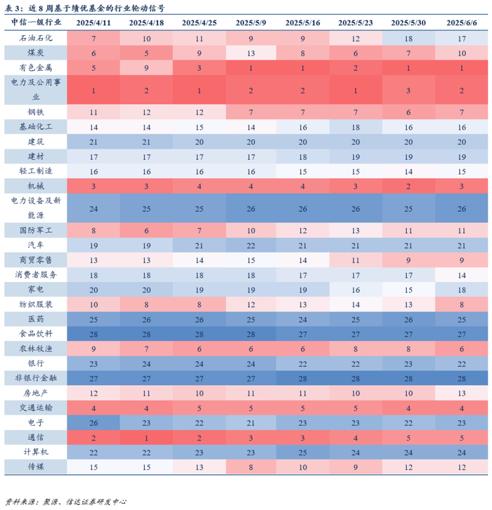 基于绩优基金持仓倾向的边际变化,我们研发了相应行业轮动模型并予以及时跟踪。本周绩优基金超配的行业包括有色金属、国防军工、通信、机械、煤炭等,绩优基金配置在向制造及TMT迁移;低配的行业包括医药、食品饮料、非银行金融、电新等,绩优基金整体对于当前机构重仓行业仍维持谨慎判断。