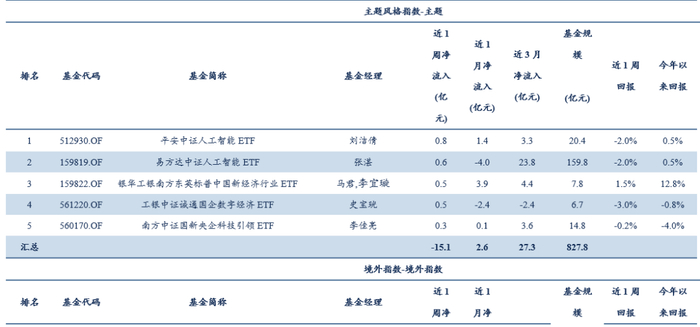 风格主题ETF方面,本周资金净流出约35.02亿元,合计规模为5153.38亿元。其中,风格ETF净流出19.91亿元,合计规模为1197.57亿元;主题ETF净流出15.12亿元,合计规模为827.81亿元。本周净流入相对较多的产品包括易方达中证红利低波动ETF、平安中证人工智能ETF。