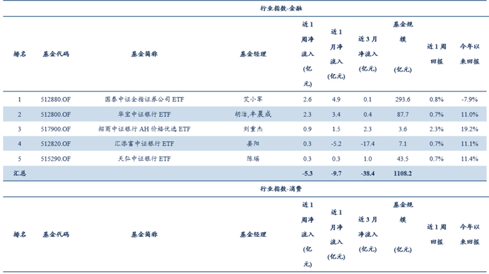 行业ETF方面,本周资金净流出约11.67亿元,合计规模为5747.32亿元。其中,TMT净流出0.72亿元,金融净流出5.26亿元,消费净流出19.85亿元,周期制造净流入14.15亿元。