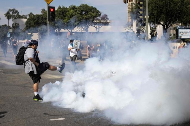 当地时间2025年6月14日,美国洛杉矶,在“不要国王”的大规模反特朗普政府集会中爆发冲突,一名示威者将催泪瓦斯罐踢回执法人员。视觉中国 图