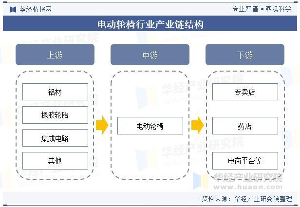 从产业链来看,电动轮椅行业上游主要包括合集成电路、合成树脂材料、橡胶材料、铝合金等原材料供应商以及硬件设备厂商;中游主要为电动轮椅生产企业;下游通过专卖店、药店、电商平台等渠道最终销售至消费者手中。