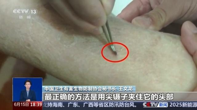 中国卫生有害生物防制协会秘书长 王文龙:一般的蜱虫叮咬以后,我们是不能拍打或者是不能用火烧这种情况,刺激它可能会扎得更深,然后它的口器会留在身体里面,造成更多的毒素的去扩散。 最正确的方法是用尖镊子夹住它的头部,然后垂直地拔下来,避免减少它毒素或者是它扩散。拔下来以后,如果说有酒精或者湿巾消毒湿巾的话,可以擦拭叮咬部位,然后如果有条件或者有袋子的话,把蜱虫装到袋子里面。后面我们发热了或者是有其他症状了,就医的时候告诉医生我们有叮咬史,然后虫子如果保存得好的话,我们可以做病原体的分离。尽快地判断出传染的是哪种病。