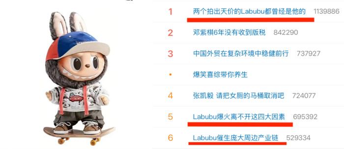 说是全民瞩目也不夸张,什么 #两个拍出天价的Labubu都曾是他的# 、#Labubu爆火离不开这四大因素# 、#Labubu催生庞大周边产业链# 、#买Labubu买的是什么# 、#一个视频看懂Labubu的前世今生#,这些话题每10分钟就能接力冲击下微博热搜Top1。