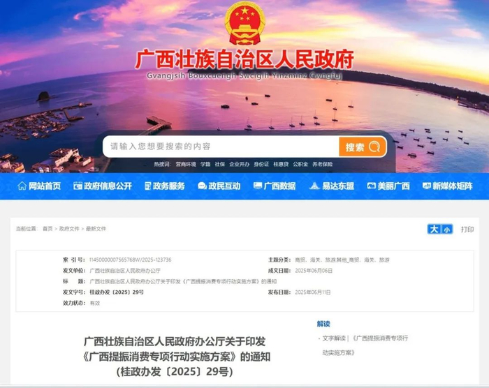 6月11日,自治区人民政府发布《广西提振消费专项行动实施方案》(以下简称《方案》),从统筹供需同向发力、优化消费环境和发挥政策协同联动等方面提出了七大行动30项具体举措。《方案》突出广西特色,结合广西资源禀赋和产业优势,支持举办“桂字号”首发首秀首展、推动桂菜走进商文旅体活动、“广西有戏”演出季等特色活动,打造差异化消费增长点。