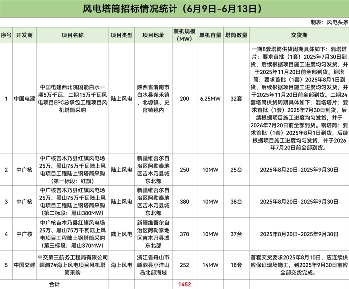 根据招标公告,陕西公司国能白水一期5万千瓦、二期15万千瓦风电项目EPC总承包工程位于陕西省渭南市白水县尧禾镇、北塬镇、史官镇镜内,为新建工程,一期5万千瓦风电项目拟安装8台单机容量为6.25MW的风力发电机组,二期15万千瓦风电项目拟安装24台单机容量6.25MW的风力发电机组。本次招标采购32套用于风力发电机组6250kW的混塔。交货时间:一期8套塔筒供货周期具体如下:混塔塔片:要求首批(1套)2025年7月30日到货,后续根据项目施工进度均匀发货,并于2025年11月20日前全部到货。钢塔筒:要求首批(1套)2025年8月1日到货,后续根据项目施工进度均匀发货,并于2025年11月20日前全部到货。二期24套塔筒供货周期具体如下:混塔塔片:要求首批(1套)2025年7月30日到货,后续根据项目施工进度均匀发货,并于2026年7月20日前全部到货。钢塔筒:要求首批(1套)2025年8月1日到货,后续根据项目施工进度均匀发货,并于2026年7月20日前全部到货。