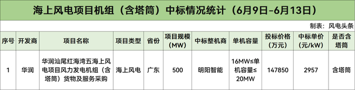 华润开标700MW,明阳智能中标650MW,东方风电中标50MW。