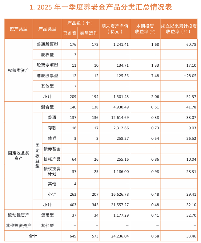 截止2025年3月31日,与上季度末相比,养老金产品备案数不变,同为649只;实际运作的产品数为573只,比上一季度末减少5只;养老金产品规模为24236亿元,比上一季度末减少107亿元。