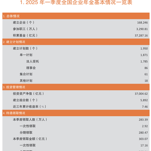 周五下班时间通常是政策数据的发布黄金时间段,2025年一季度的企业年金和养老金产品的统计数据如约发布,人社部公开披露了一季度企业年金和养老金产品的详细统计数据,具体如下: