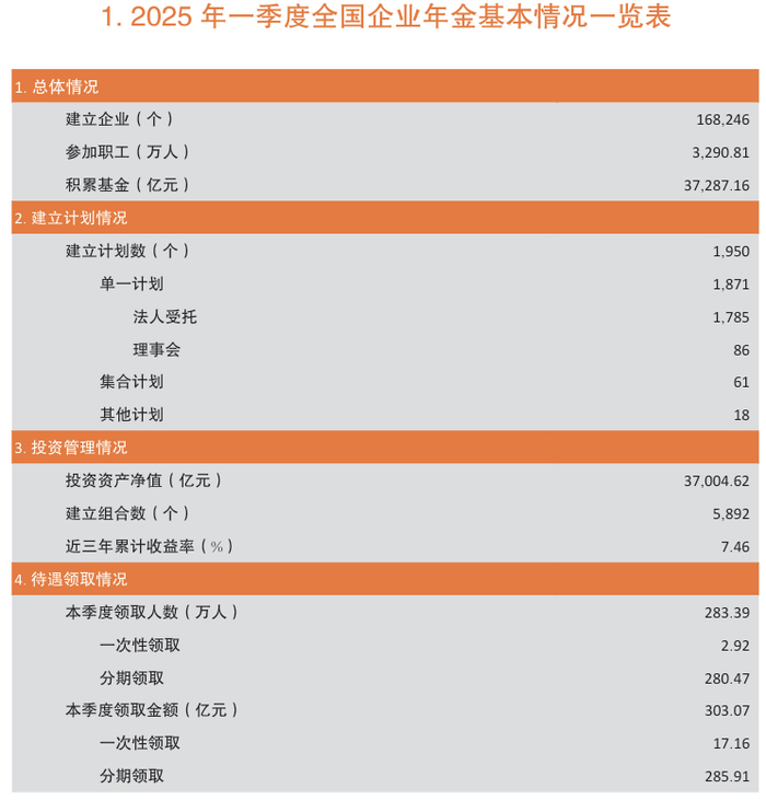 截止2025年3月31日,企业年金的规模已达3.7287万亿元,参加人数为3290.81万人,参加的企业数量为16.8246万户。