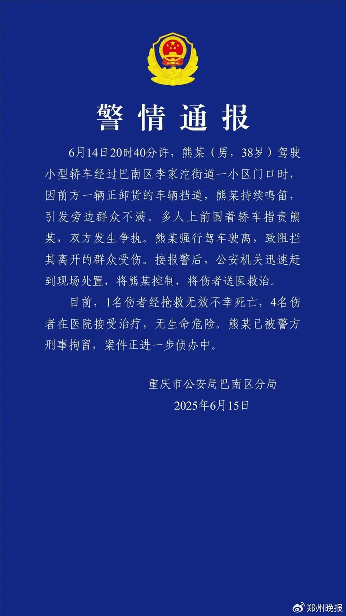 6月14日20时40分许,重庆巴南区一男子因持续鸣笛引发冲突,驾车强行驶离致1死4伤,涉事司机已被刑拘。