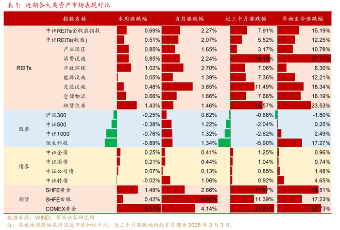 大类资产角度,本周REITs各资产板块均上涨,整体跑赢权益市场(沪深300、中证500、中证1000和恒生科技)、债券市场(中证全债、中证国债、中证公司债、中证转债)和沪银,跑输黄金(沪金和COMEX黄金)。