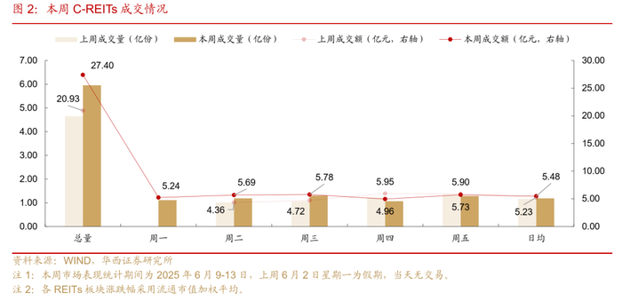 个券层面,本周交易活跃度前三的分别是国泰君安临港创新产业园REIT、华夏深国际REIT和华夏特变电工新能源REIT,日均换手率分别达到2.7%、2.1%和1.5%,当周价格涨跌幅分别为1.37%、0.45%和0.49%,其中国泰君安临港创新产业园REIT也是扩募概念股,其扩募申请已于2025年5月30日获上交所审核通过。本周交易活跃度靠后的是华夏大悦城商业REIT,日均换手率仅0.1%。