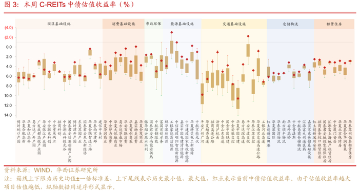 本周七大REITs板块中,消费板块REITs仍处于高估值状态。能源板块除了鹏华深圳能源REIT外,其他6只当前中债估值收益率也低于历史均值-1倍标准差,工银蒙能清洁能源、中信建投明阳智能新能源和华夏特变电工新能源的中债估值收益率为负。租赁住房板块当前估值收益率基本也处于历史低位,市场估值一致性较强。园区基础设施、市政环保、交通基础设施和仓储物流估值表现分化较为明显,部分个券的后续业绩表现,值得跟踪。