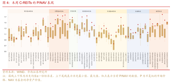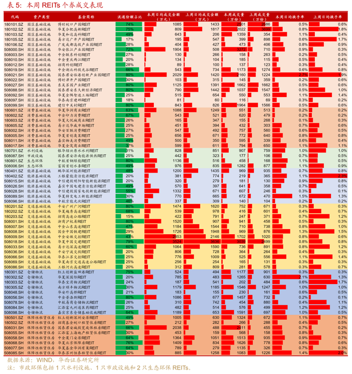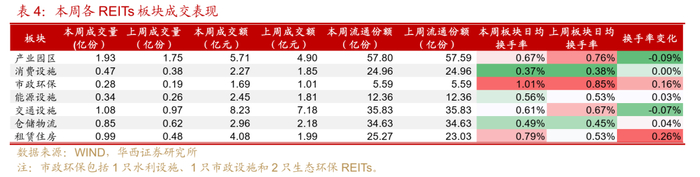 分板块来看,本周日均换手率靠前的分别是市政环保(1.01%)、租赁住房(0.79%)和产业园区(0.67%),其中市政环保、租赁住房近两周的交易持续升温。本周市政环保交易活跃主要受中航首钢绿能REIT和富国首创水务REIT带动,二者日均换手率本周均突破1%。