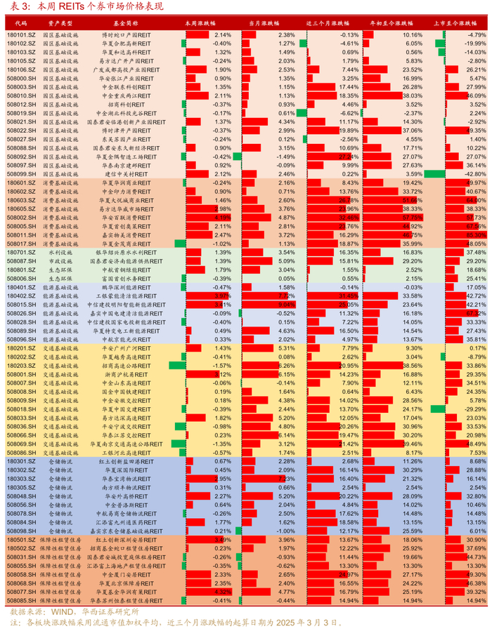 个券层面,华夏基金华润有巢(租赁住房)、华安百联消费(消费设施)、工银蒙能清洁能源(能源设施-风电)3只REITs领涨,涨幅分别为4.32%、4.19%和3.97%。招商高速公路(高速公路)、华夏南京交通高速公路(高速公路)、华夏金茂商业(消费设施)3只REITs领跌,跌幅分别为1.57%、1.35%和1.02%。