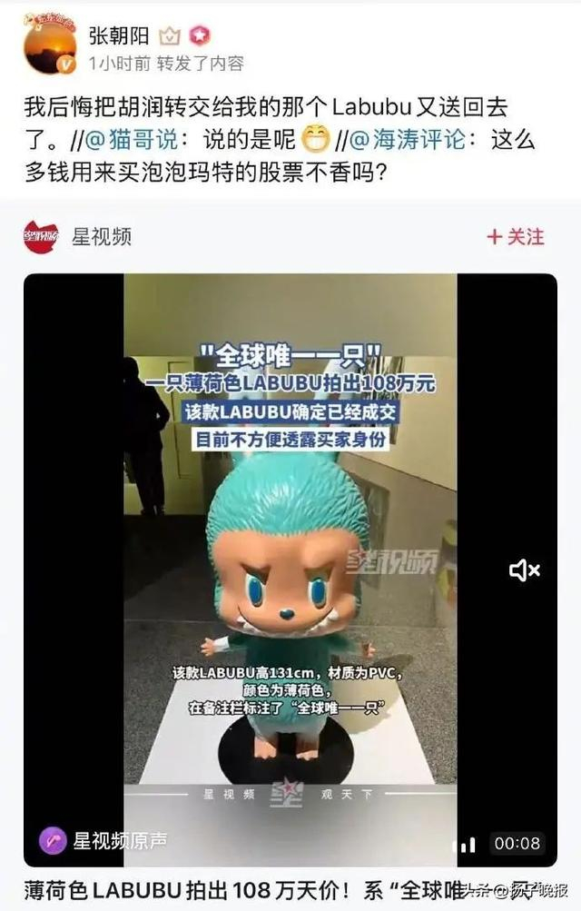 近日,“张朝阳后悔送回绝版LABUBU”的词条冲上热搜。6月15日,胡润发视频透露了这个绝版LABUBU的新去向。