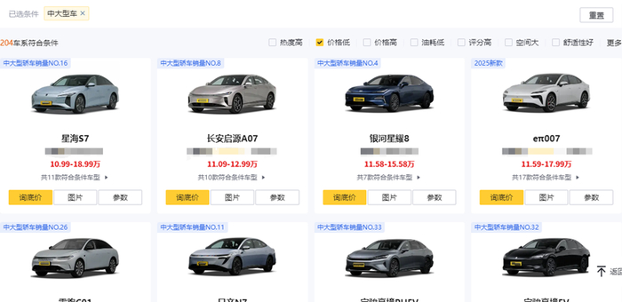 再一个,市面上的中大型轿车,哪怕价格从低到高去排序,现在比它起售价便宜的,也就是东风星海S7和长安启源A07,而这两台车的车长,无一例外的都没有突破5米,卡在4米9出头的范围,而星耀8的车长5018毫米、轴距2928毫米。