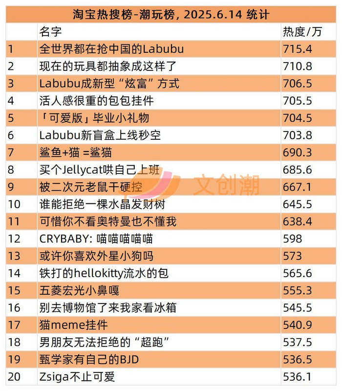 淘宝热搜潮玩榜,每日实时更新,文创潮6月14日统计到的前六名有一半是Labubu,分别是: