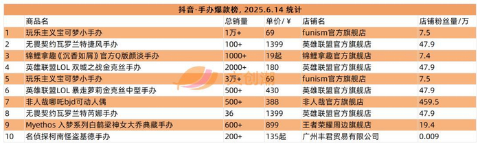 实时更新的抖音手办爆款榜,6月14日文创潮统计时的前五如图所示。