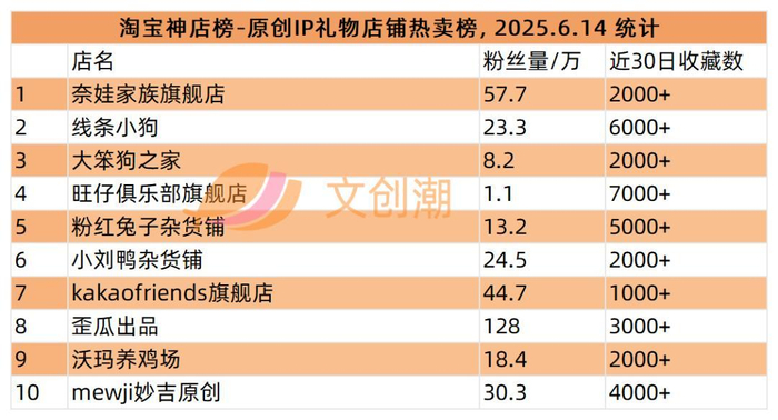 本周统计到的文创IP衍生店铺热卖榜,前五分别是: