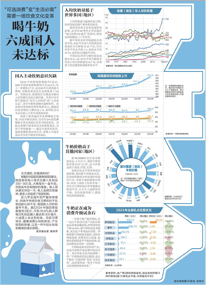 近几年全国牛奶产量持续增长,但由于传统饮食习惯和对于乳制品的认知不足,我国的人均饮奶量并不高。据《2024中国奶商指数报告》显示,只有35.6%的人群每日乳制品摄入量达到300毫升,六成国人未达到标准。饮奶习惯背后,藏着消费认知的断层、产业转型的阵痛,以及一杯牛奶从牧场到餐桌的漫长旅程。新京报记者 陈华罗