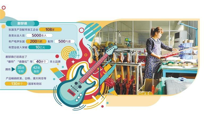 从最初的镇办乐器厂到合资乐器厂,再到后来一大批本土电吉他生产企业蓬勃发展,鄌郚镇的“耳朵产业”做得风生水起。经过50多年的发展,今天的鄌郚镇年产电吉他200万把、配件500万套,占全国电吉他产量的四成、全球产量的三成,远销130多个国家和地区,年收入超过10亿元,不仅拥有先进的生产技术和大量熟练工人,而且形成了一条完整的电吉他产业链。
