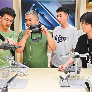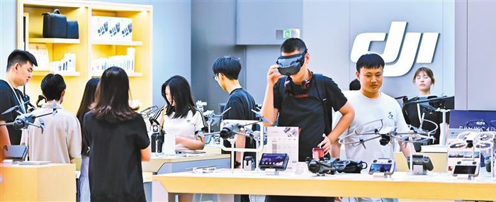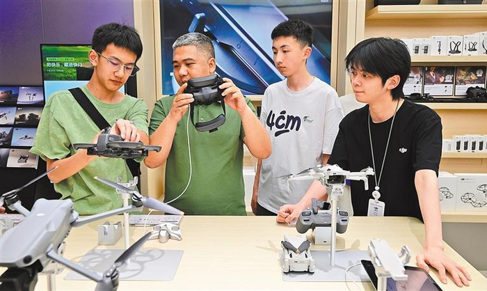◀5月4日,浙江省金华市婺城区的一家商场内,消费者在选购无人机。今年全国多地继续发放以旧换新补贴,激发消费活力。时补法摄(中经视觉)