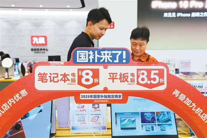 ◀6月11日,江西省南昌市红谷滩区一商场专卖店,顾客在选购数码产品。商务部数据显示,截至5月31日,2025年消费品以旧换新五大品类合计带动销售额1.1万亿元,发放消费者补贴约1.75亿份。