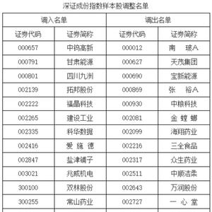 根据安排,深证成指样本股调入中钨高新、甘肃能源、四川九洲、拓邦股份、福晶科技、建设工业等20只个股,调出南玻A、天茂集团、宝新能源、张裕A、中粮科技、金螳螂等20只个股。
