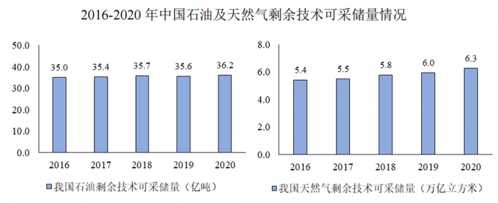 中国石油及天然气资源较为丰富,近年来,中国石油储量保持稳定,天然气储量呈稳步增长态势。2020年,中国石油剩余技术可采储量为36.2亿吨;天然气剩余技术可采储量为6.3万亿立方米。