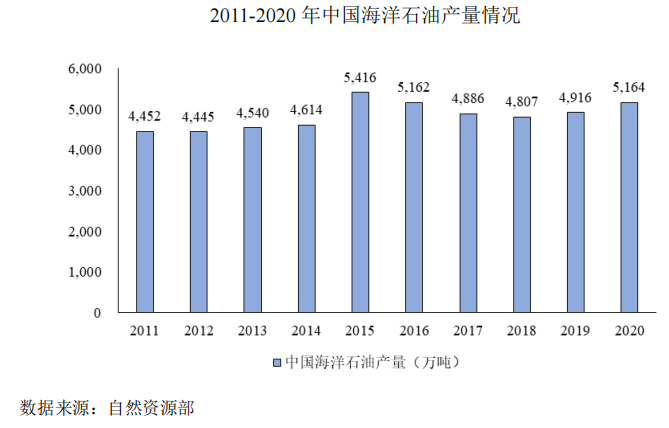 中国海洋油气资源总量丰富,是中国油气资源重要组成部分,2020年,中国海洋石油产量 5,164万吨,较2019年增长248万吨,增量占中国国内石油增量的80%以上,2011-2020年海洋石油产量复合增长率为1.7%;海洋天然气产量186亿立方米,较2019年增长24亿立方米,2011-2020年海洋天然气产量复合增长率为4.8%。