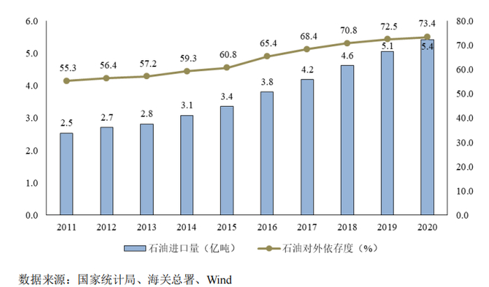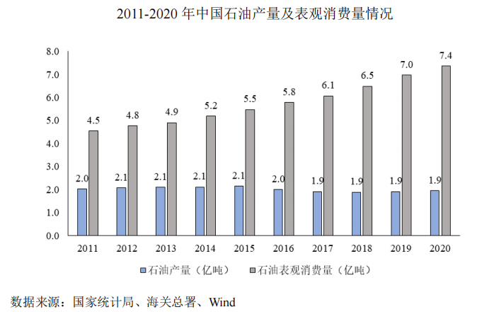 石油需求增速高于产量增速,对外依存度逐年上升,2011年石油表观消费量4.5亿吨逐年增长至2020年的7.4亿吨,但石油产量近几年持续保持在1.9亿吨,需求缺口呈逐步扩大趋势,对外依存度从2011年55.3%逐年增长至2020年的73.4%;