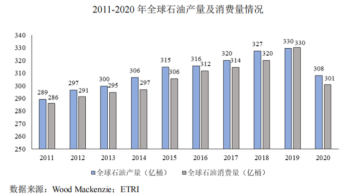 全球石油产量过去十年与需求量变动基本一致,市场基本处于均衡状态。2019年,全球石油产量329.7亿桶,较2011年增加40.6亿桶,2011-2019年年均复合增长率为1.7%。2020 年受疫情影响供需双降,目前已经逐渐恢复。