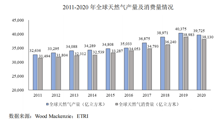 全球天然气供需过去十年基本平衡,增速高于石油,2019年,天然气产量为4.0万亿立方米,较2011年增长0.8万亿立方米,2011-2019年年均复合增长率为2.7%,高于石油近十年复合增长率。