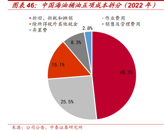 公司桶油成本主要有下列五项:折旧、折耗和摊销、除所得税外其他税金、弃置费、作业费用、销售及管理费用。