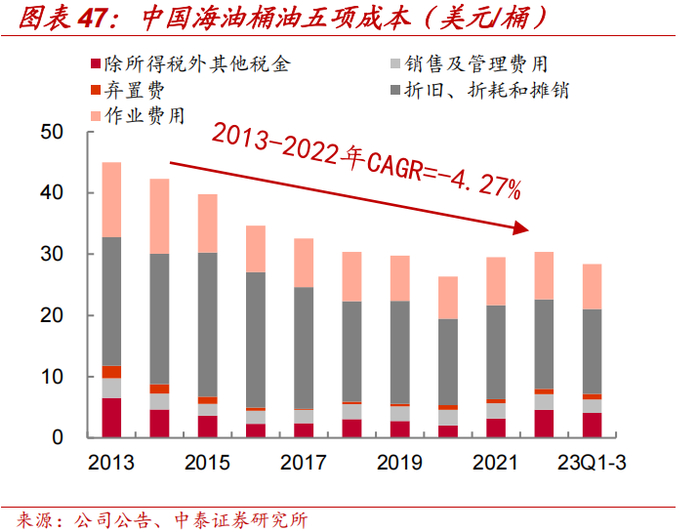近10年公司桶油成本以复合-4.27%的速度下降,2013年桶油成本为45元左右,下降至2024年的28.5美元/桶