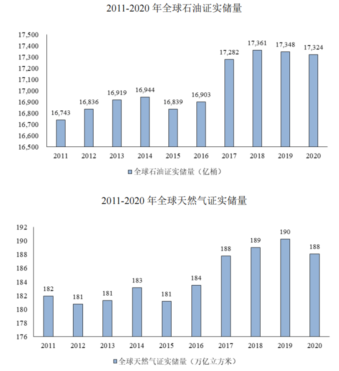 全球油气资源总量丰富,勘探开发潜力较大。截至2020年末,全球石油证实储量为1.7万亿桶,储量寿命为53.5年;全球天然气证实储量为188.1万亿立方米,储量寿命为48.8年。总体上全球油气储量充足。