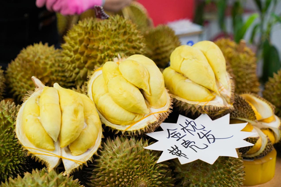 “这个是马来西亚猫山王,它的口感扎实黏糯,味道会更丰富一些,入口是极致的甜,会有花香、坚果香扑,这种也很受欢迎。”