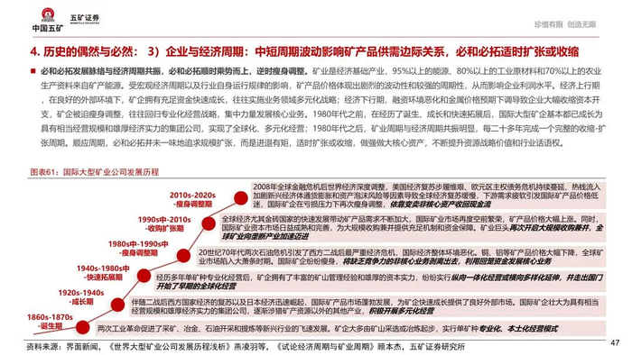 本篇为“矿业巨头启示录系列报告”的第三篇,聚焦全球第一大上市矿企必和必拓的成长史及资源增长路径,总结其世纪矿业帝国实现跨越式发展的关键成因,为中资矿企建设世界一流企业提供启发与思路。报告分为四个部分: