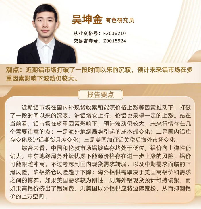 近期铝市场在国内外现货收紧和能源价格上涨等因素推动下,打破了一段时间以来的沉寂,沪铝增仓上行,伦铝也录得一定的上涨。站在当前看,铝市场在多重因素影响下,预计波动仍较大,未来行情存在几个需要注意的点。