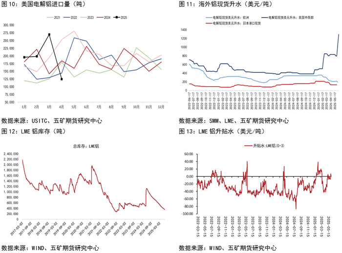 美国以外,目前LME市场随着铝锭库存减少,现货供应边际收紧,Cash/3M贴水幅度较4月份明显收窄,也给予铝价较强的支撑。往后看,美国高铝价和需求之间的博弈或成为关键,如果美国需求较为刚性,则海外铝现货预计维持偏紧,而如果高铝价挤出了铝消费,则美国以外铝供应将边际宽松,并将限制铝价的上方空间。