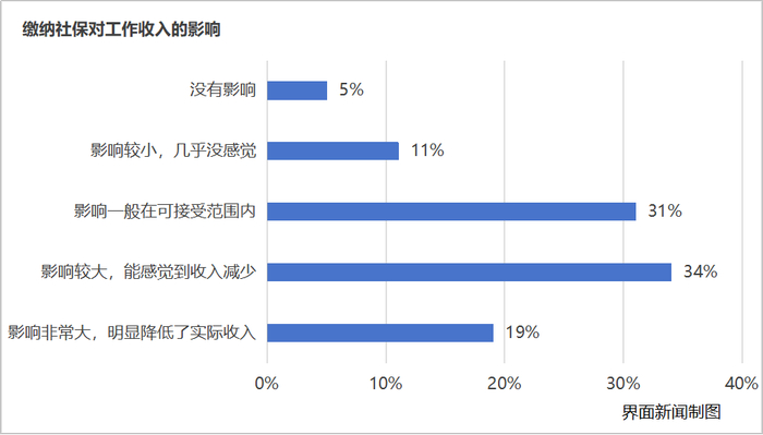 6.在骑手目前参与的保险类型里,意外伤害险和城乡居民基本医疗保险是主要险种。在多选题“您目前参加了哪些社会保险”中,意外伤害险与城乡居民基本医疗保险的占比比例最高,分别占比为34%、35%。同时,界面新闻通过后续访谈了解到,多数骑手认为,意外险和城乡居民基本医疗保险已能够满足他们的基本生活保障需求,而其他险种对他们而言只会增加缴纳负担。尤其是一些刚入行不久的年轻骑手,他们更直言不讳地表示,养老保险目前并不在自己的考虑范围内,因为平台已经为他们缴纳了意外伤害险,这在他们看来已经足够。