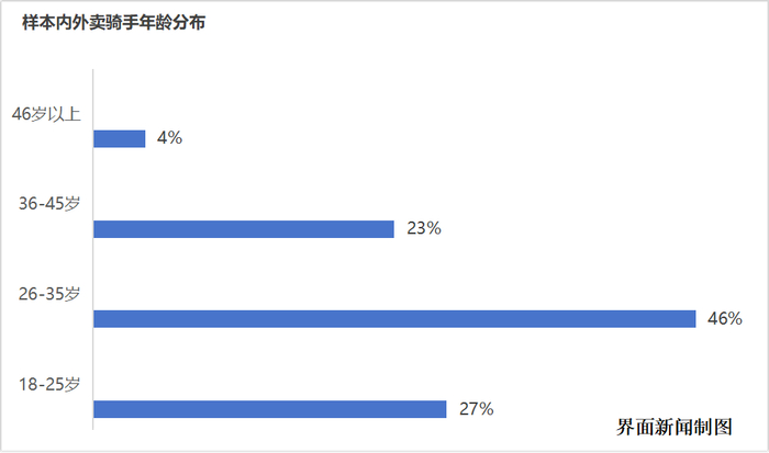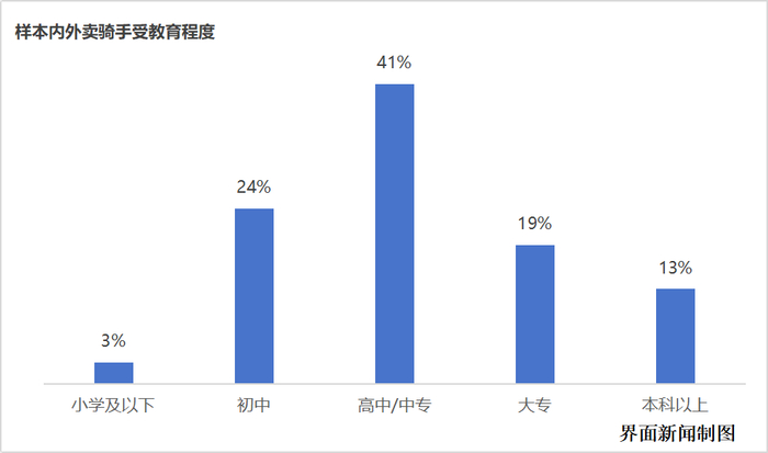 调研对象的基本画像可在问卷数据中窥见一斑:随机调查样本范围内,从业者以男性居多,年龄层面主要集中在26至35岁的中青年群体。外卖骑手的受教育程度整体偏低。